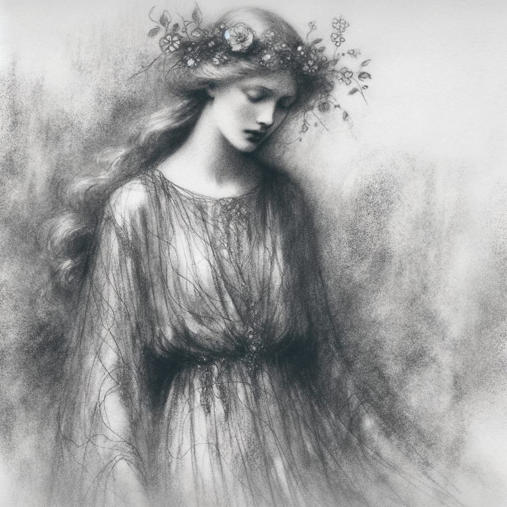 A striking picture of a Norse goddess in a melancholic pose. The black and white charcoal sketch showcases delicate lines and subtle shading, reminiscent of Romantic-era paintings.