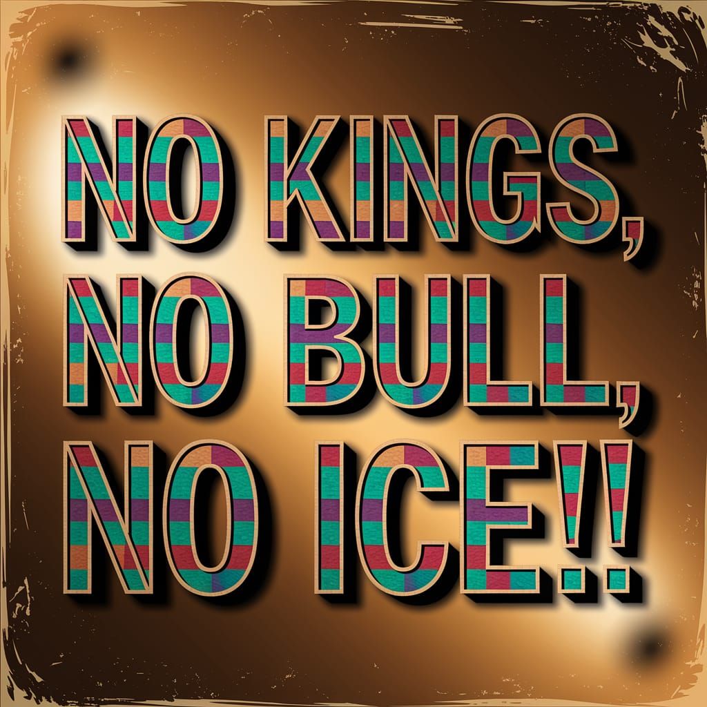 This image shows four lines of text in vibrant Madras block letters against a vintage wallpaper background. The words "NO KINGS," "NO BULL," and "NO ICE!" stand out in this high-quality photograph.
