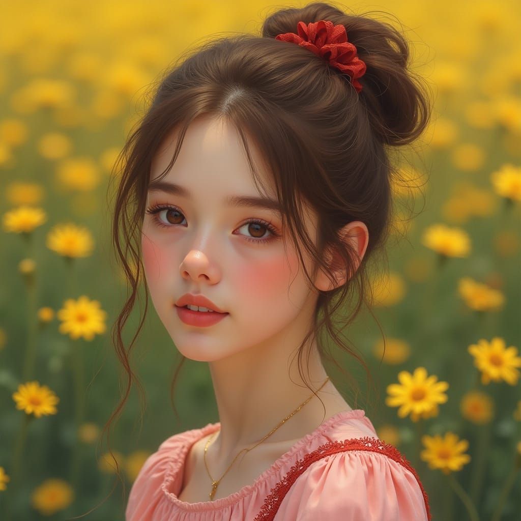 A hyperrealistic 8k portrait of a smiling young woman with light brown hair styled in a loose bun with red lace. She wears a soft pink blouse, set against blurred yellow flowers, in an art nouveau style.