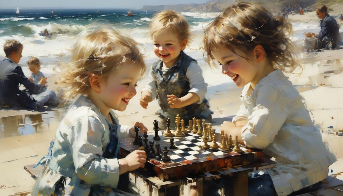 A heartwarming image of a brother and sister playing chess on a sunny beach. This painting captures the joy and laughter of childhood in a vibrant, detailed style reminiscent of fine art.