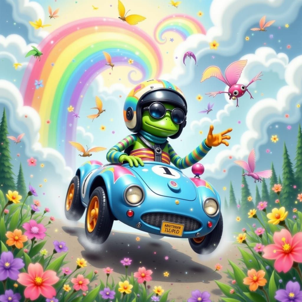A watercolor image of Kermit the Frog driving a race car over a rainbow. The artwork features bright colors and a whimsical aesthetic, with liminal undertones, in the style of children's art.