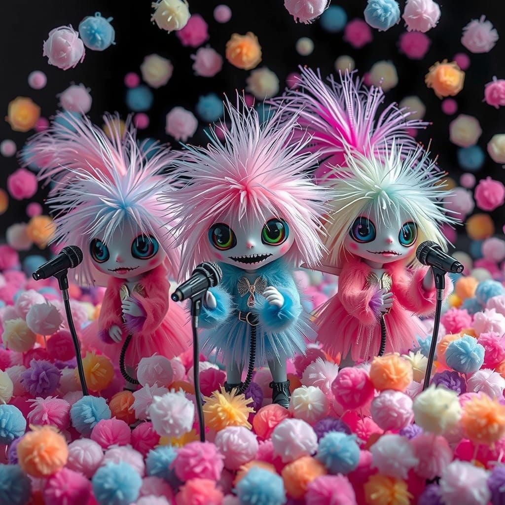 A vibrant image of winged goth fairy creatures holding microphones amidst a pastel-colored storm of fluff. The artwork is reminiscent of pop surrealism with dark, quirky undertones.