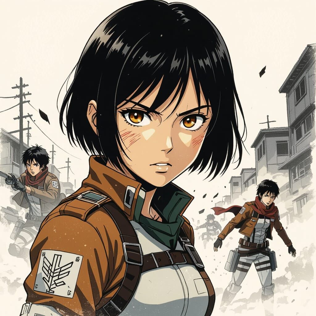 This image shows a determined young woman battling Titans. She wears a Survey Corps uniform, rendered with bold lines and dramatic shading in a manga style. The scene evokes dark fantasy and gritty realism.
