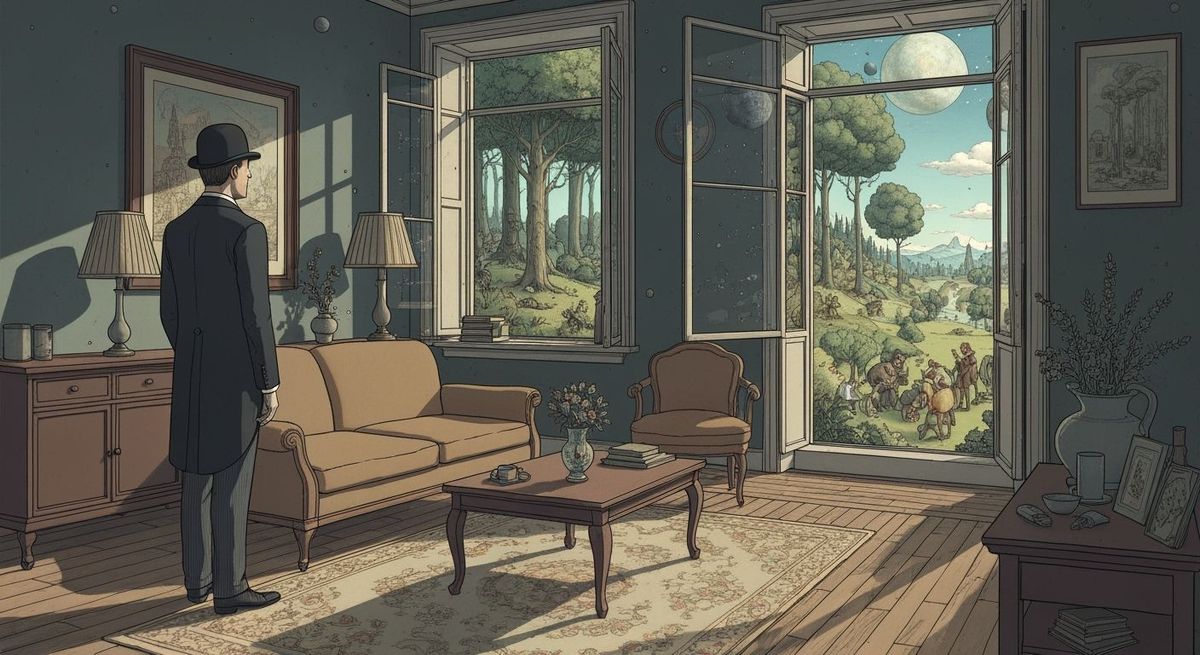 This image shows a man in formal attire observing a fantastical Belgian forest through a window in a surreal living room filled with the cosmos. Rendered in the ligne claire style, it features crisp lines and flat colors with soft lighting.