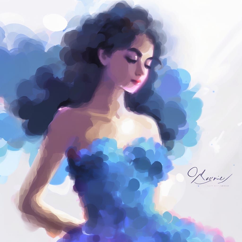 This image is a captivating blend of glitchy, pixelated elements and classical influences from vintage anime, featuring a girl dressed in a luxurious, strapless dress with a puffed and scalloped design, set against a minimalist background.