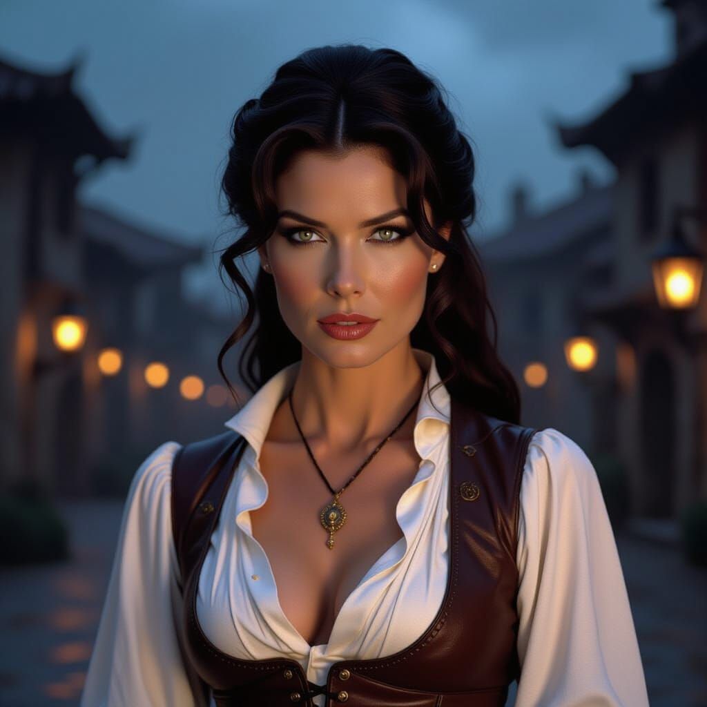 A close-up of actress Catherine Zeta Jones. Her eyes sparkle seductively. She wears a white tunic with brown leather waistcoat and a brown skirt. Her look is to her character in The Mask of Zorro movie. The background is a misty medieval town square illuminated by candlelight lanterns. The sky is stormy ...