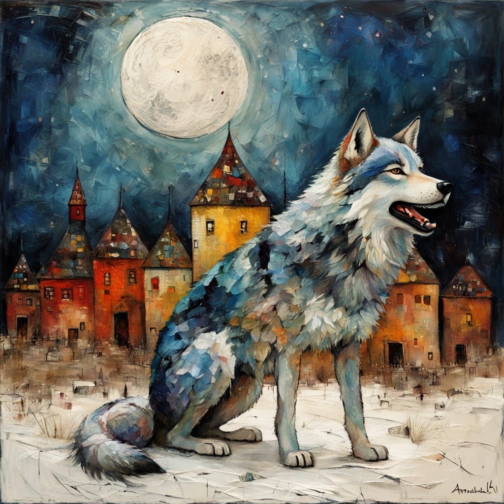 This image shows a lone wolf with glowing eyes howling at a crescent moon, rendered in a textured, primitive, naive art style with thick impasto.