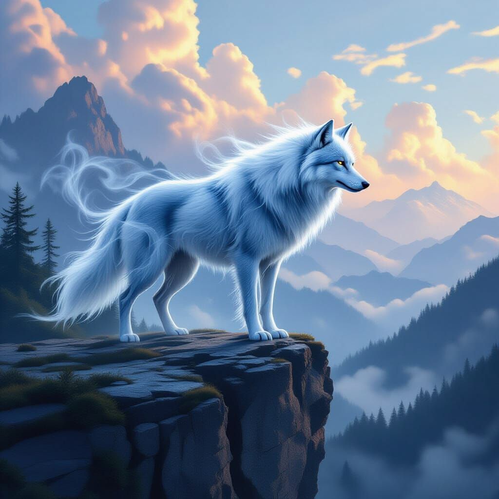 A majestic smoke wolf stands on a cliff overlooking a forest. The wolf has a transparent, ethereal appearance, reminiscent of a patronus, set against a vista created as an oil painting.