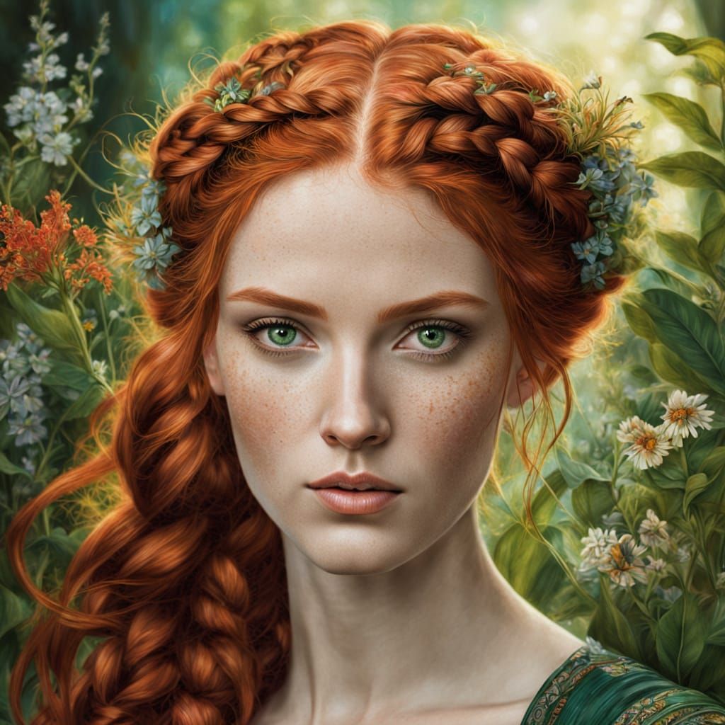 This image shows a photorealistic portrait of a young woman with vibrant red hair and striking green eyes, featuring intricate braids and wildflowers. The style emphasizes natural beauty and rich colors.
