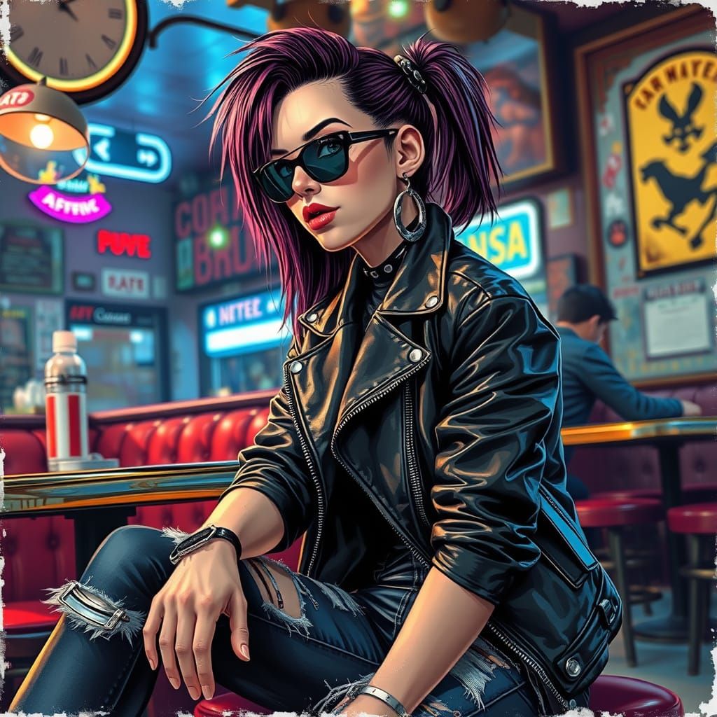 This image depicts a female punk sitting in a vibrant, colorful vintage cafe, surrounded by intricate details and dramatic lighting, showcasing a blend of hyperrealistic and concept art styles.