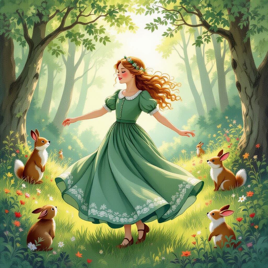 This image shows a young girl dancing in a forest, wearing a flowing green dress while surrounded by animals. The artwork is reminiscent of classic children's book illustrations.