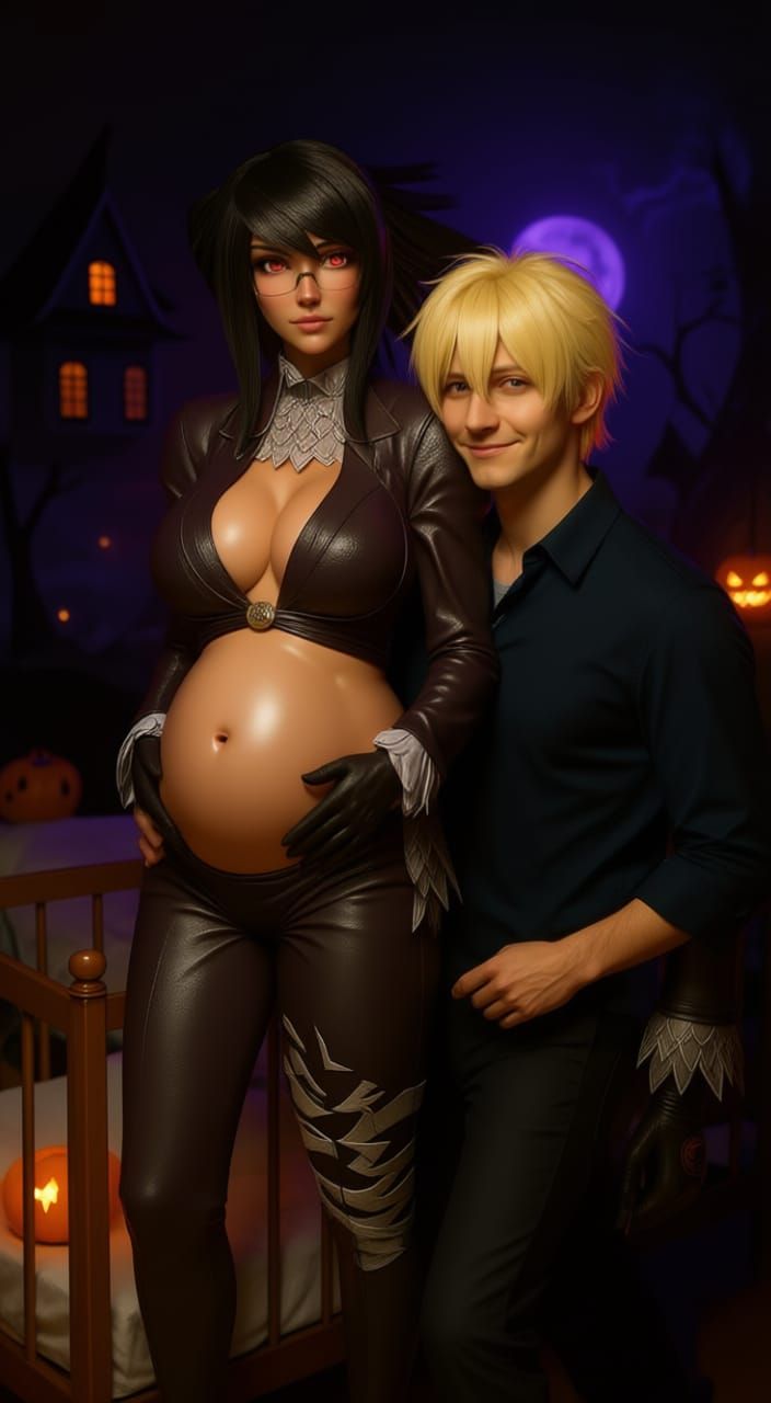 This image depicts a hyperrealistic scene of a pregnant Nya/Nyarlathotep and her husband enjoying a Halloween night in their bedroom. The style is reminiscent of high-resolution photography.