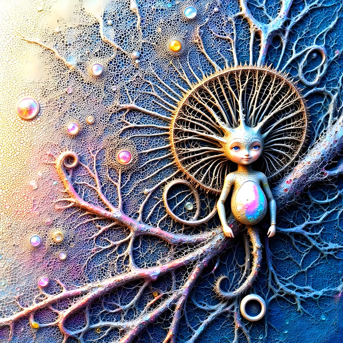 This surreal digital art depicts a divine elven child with translucent ears, holding a stylized dried flower pod doll. The image features intricate details, glowing ethereal ambiance, and a dreamlike quality inspired by abstract expressionism.