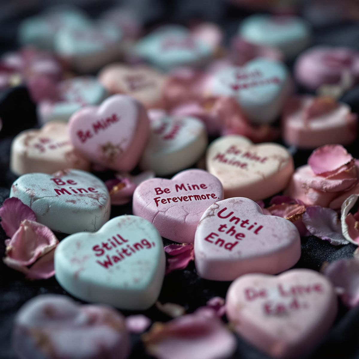This image captures cracked candy hearts with eerie pastel colors and unsettling inscriptions scattered on dark velvet. Lit by candlelight, it evokes a gothic Valentine aesthetic with a moody, vintage feel.