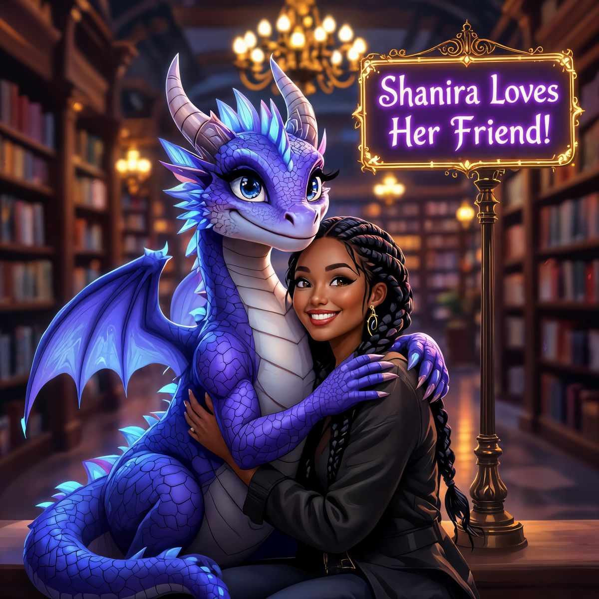 This image shows a purple and blue dragon and a Black woman embracing in a library. The dragon has glowing scales and wings, and the woman has braided hair. A sign reads "Shanira Loves Her Friend!".