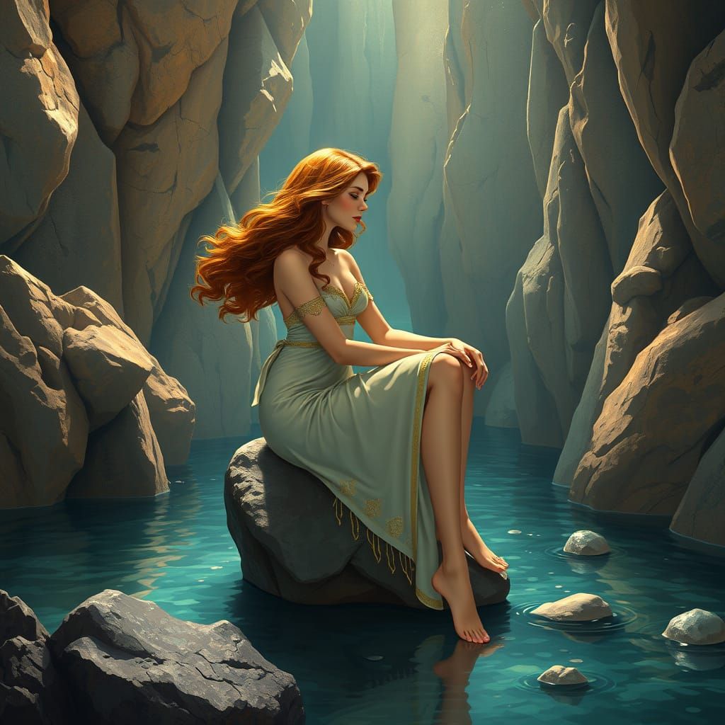 This image shows a tall, curvy water nymph with long, flowing golden hair, wearing a classic Greek tunic. She sits on a rock, legs submerged in a clear pond, lit with dynamic light in triadic colors.