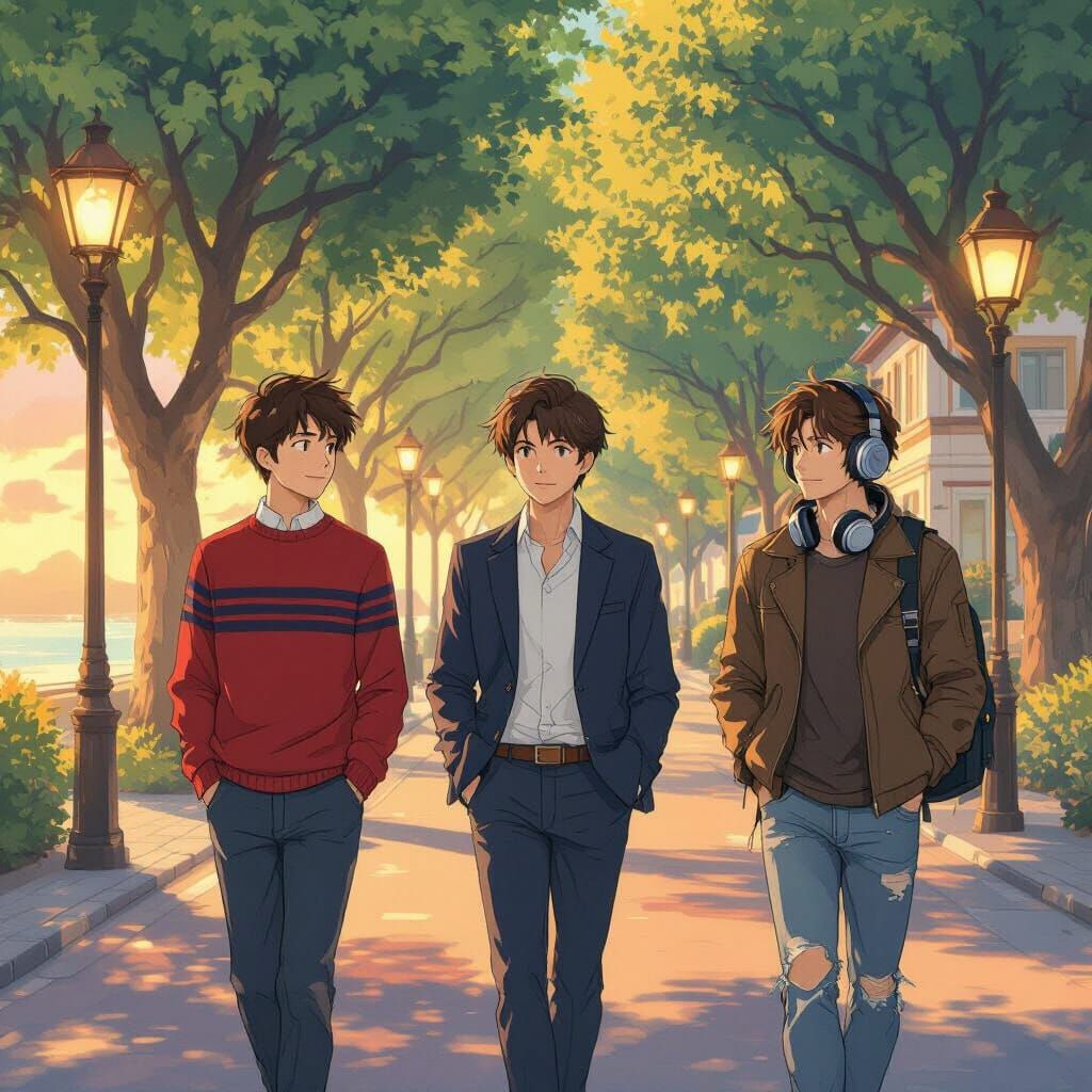 This image shows three stylish young men walking together down a tree-lined street at sunset. The scene is lit with warm, cinematic lighting and soft shading in an anime aesthetic.