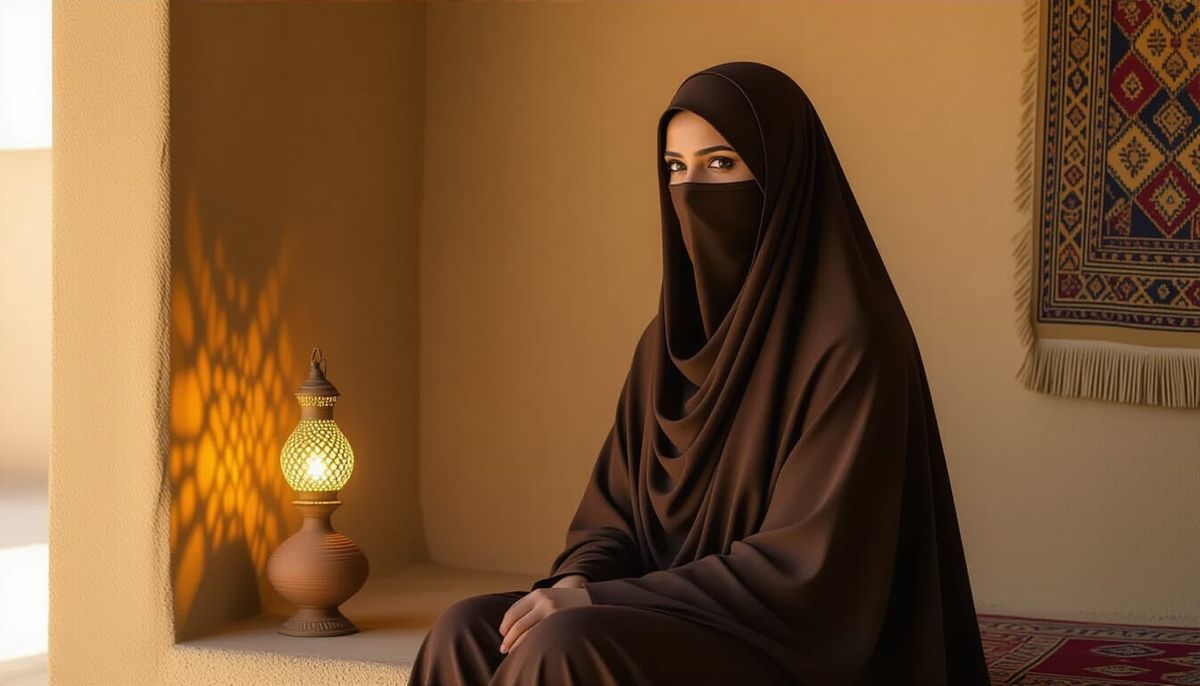 A hyperrealistic image shows a serene Muslim woman in a dark abaya and light niqab, standing in a simple mud house. A clay lamp casts a warm glow, highlighting her calm eyes and dignified posture with dramatic sidelighting. The image is reminiscent of digital painting with a colorful, textured background...