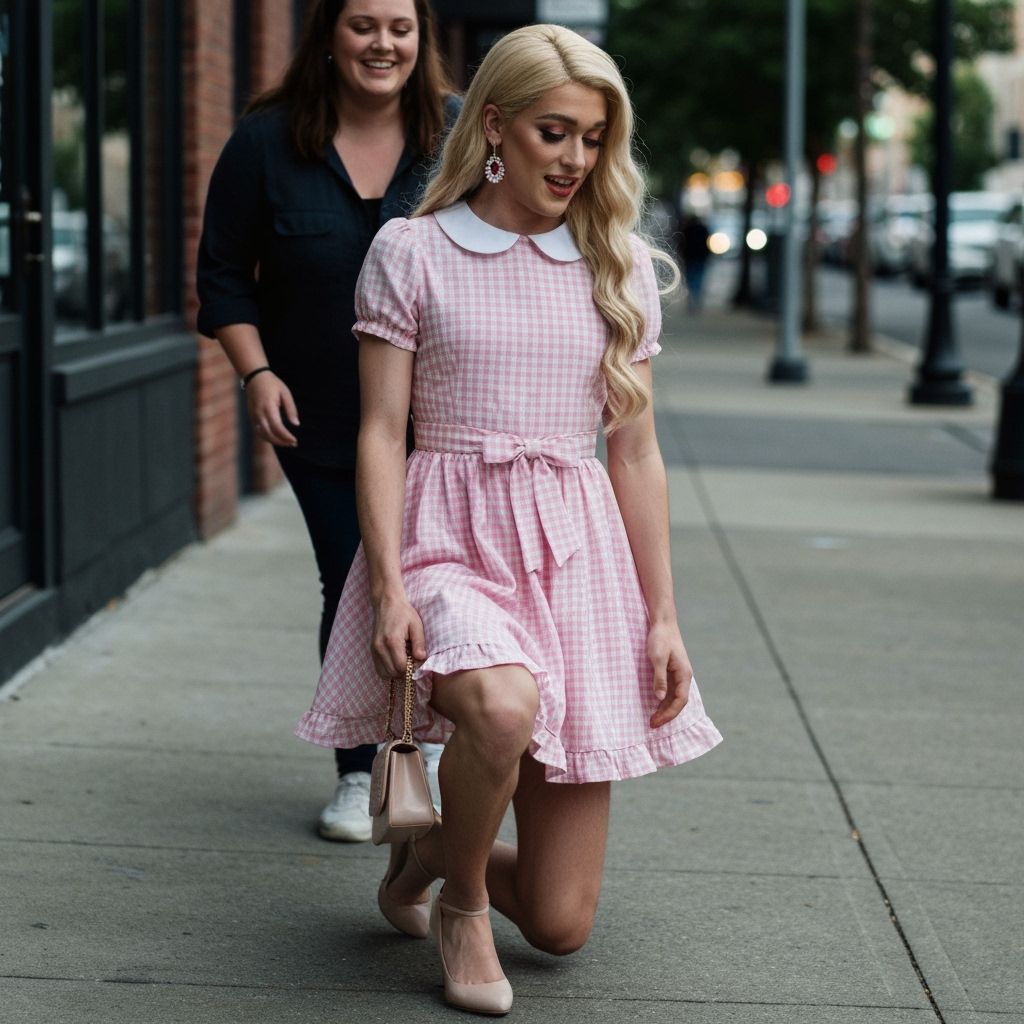This cinematic image captures a young man in a frilly plaid dress and heels, embarrassed as he kneels to fix his shoe. A woman smiles in the background. Shot with film grain and atmospheric lighting.