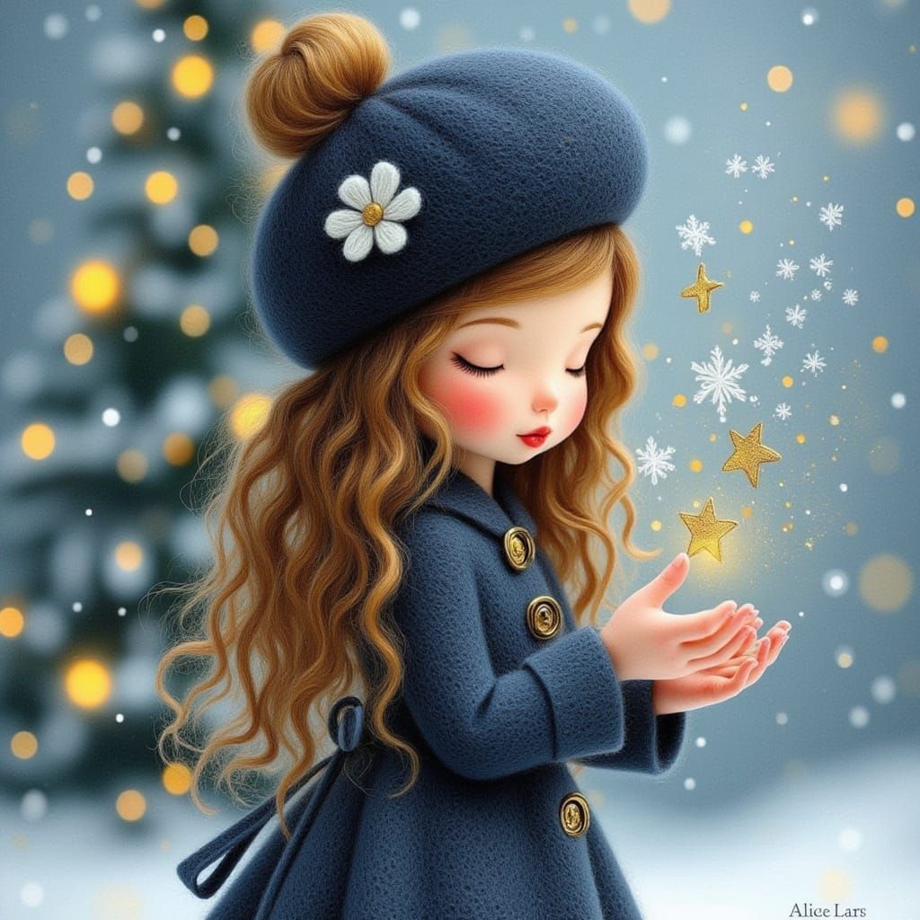 This image shows a sweet scene of a girl with brown hair holding stars and snowflakes, wearing a blue beret. It's rendered in a romantic watercolor style with acrylic and oil elements.