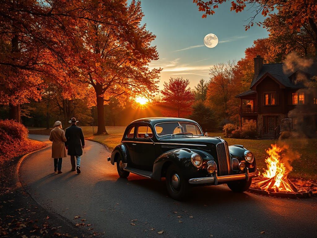A scenic shot of an autumn date night with stargazing by a bonfire. The vintage car navigates a winding road through a dense jungle, enhanced by golden sunrise hues.