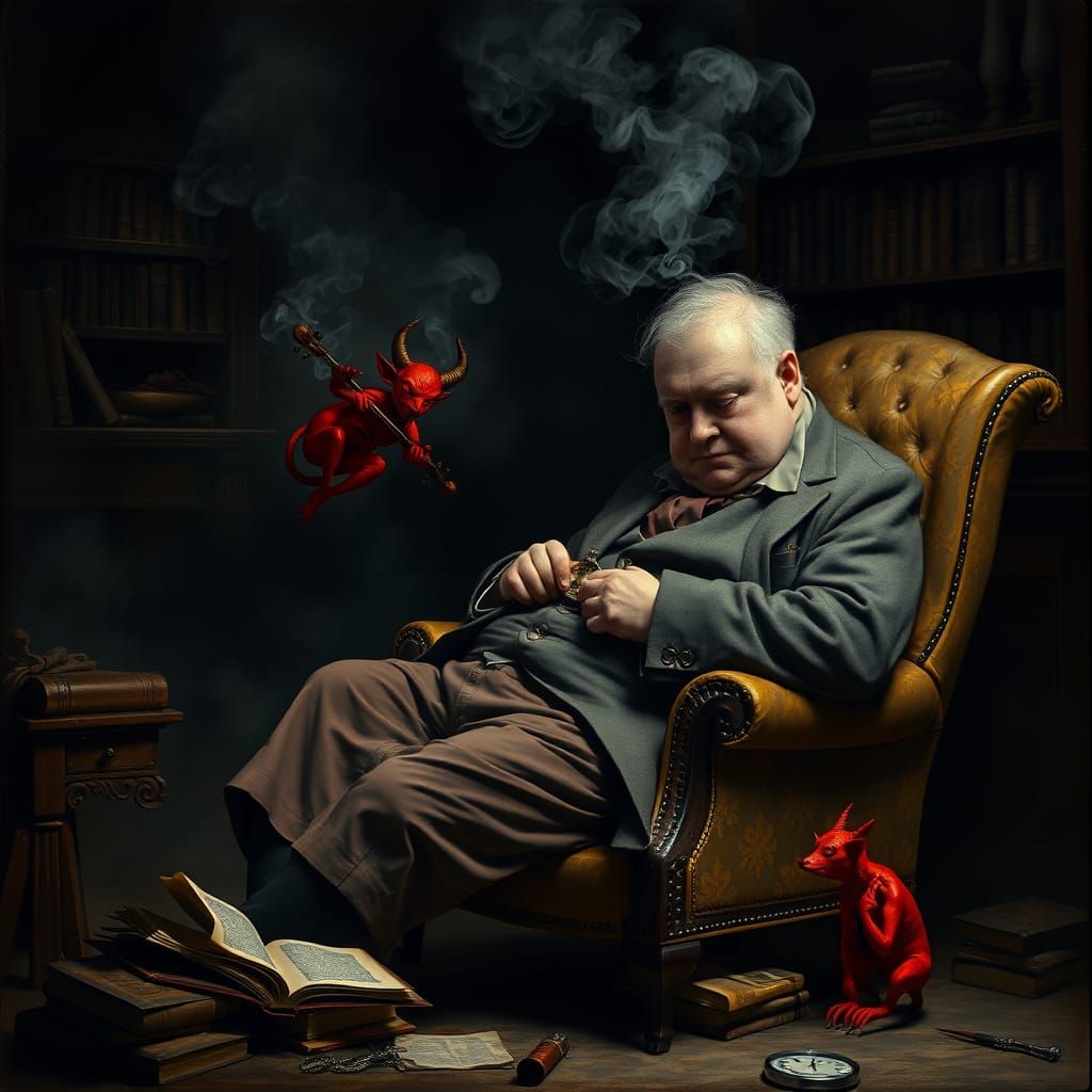 This image shows an overweight, elderly man in vintage clothing examining a pocket watch in a smoky, dark room. The scene, reminiscent of chiaroscuro paintings, also features a small red demon playing the violin.