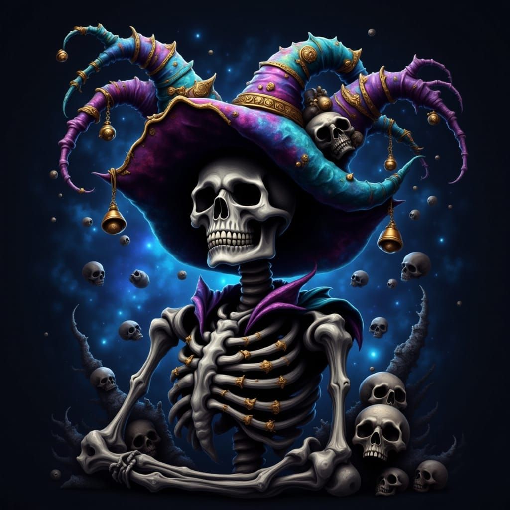 This image shows a detailed skeleton wearing a colorful jester hat, surrounded by skulls in a dimly lit, dramatic galaxy. It evokes a danse macabre theme with realistic rendering.