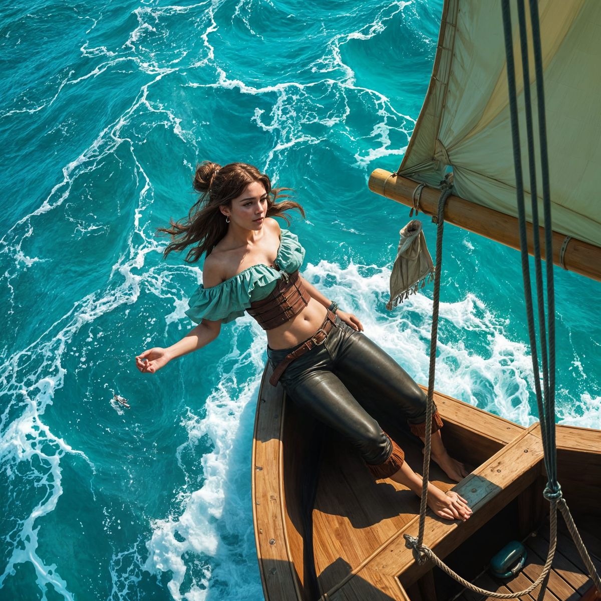 A beautiful illustration of a female pirate sailing on a turquoise sea. The fairytale style image features detailed waves and a vibrant color palette, creating a sense of adventure.