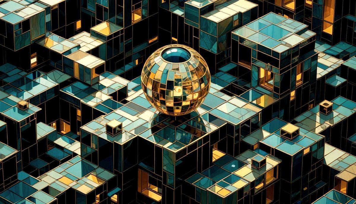 A stained glass apple orb with a Kintsugi design, illuminated by dappled sunbeams. The image features detailed apple blossoms and iridescent pearls in jewel tones, with volumetric lighting.