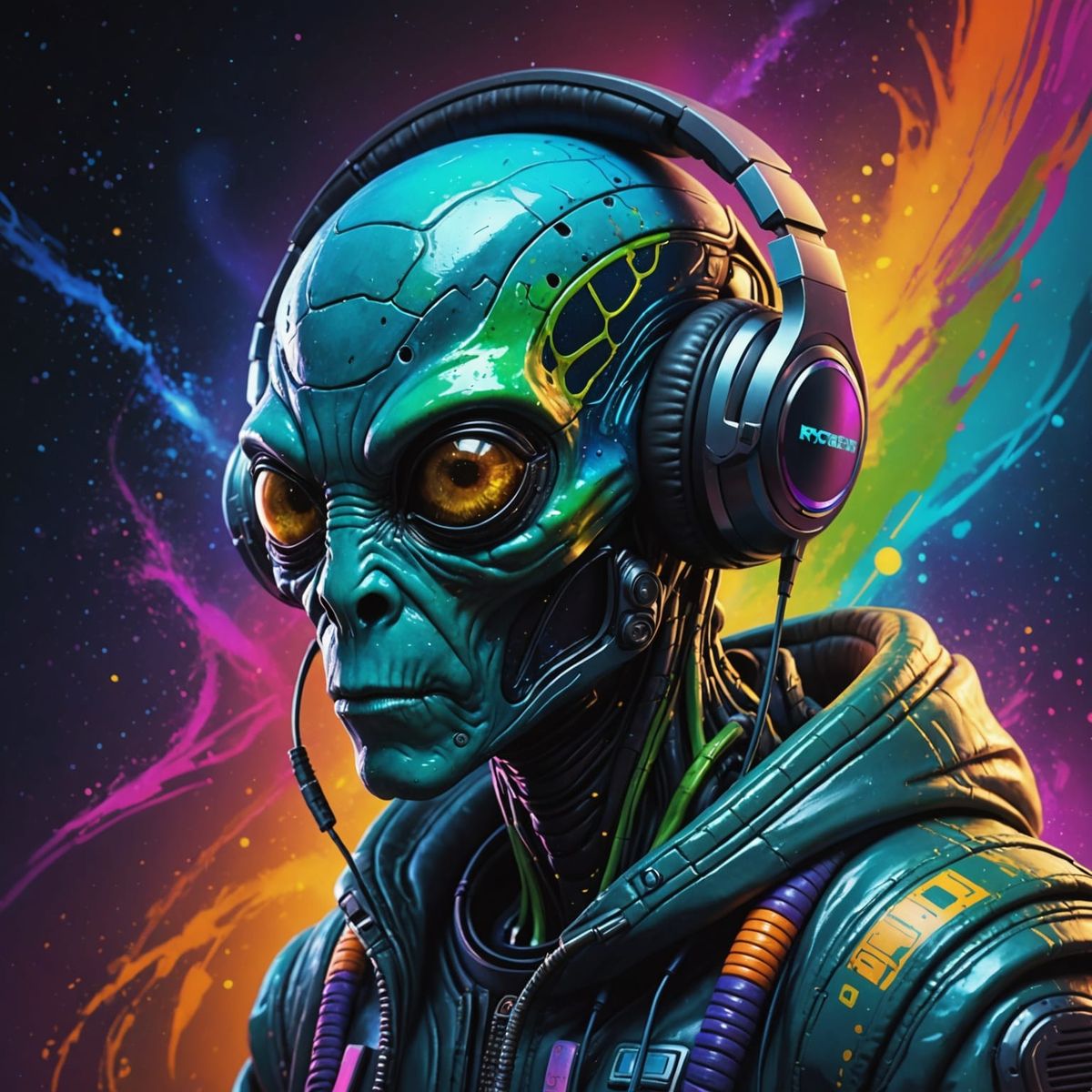 This image shows a hyperrealistic alien enjoying music with headphones. The mid shot, with side lighting and a colorful background, creates a dramatic and detailed scene.