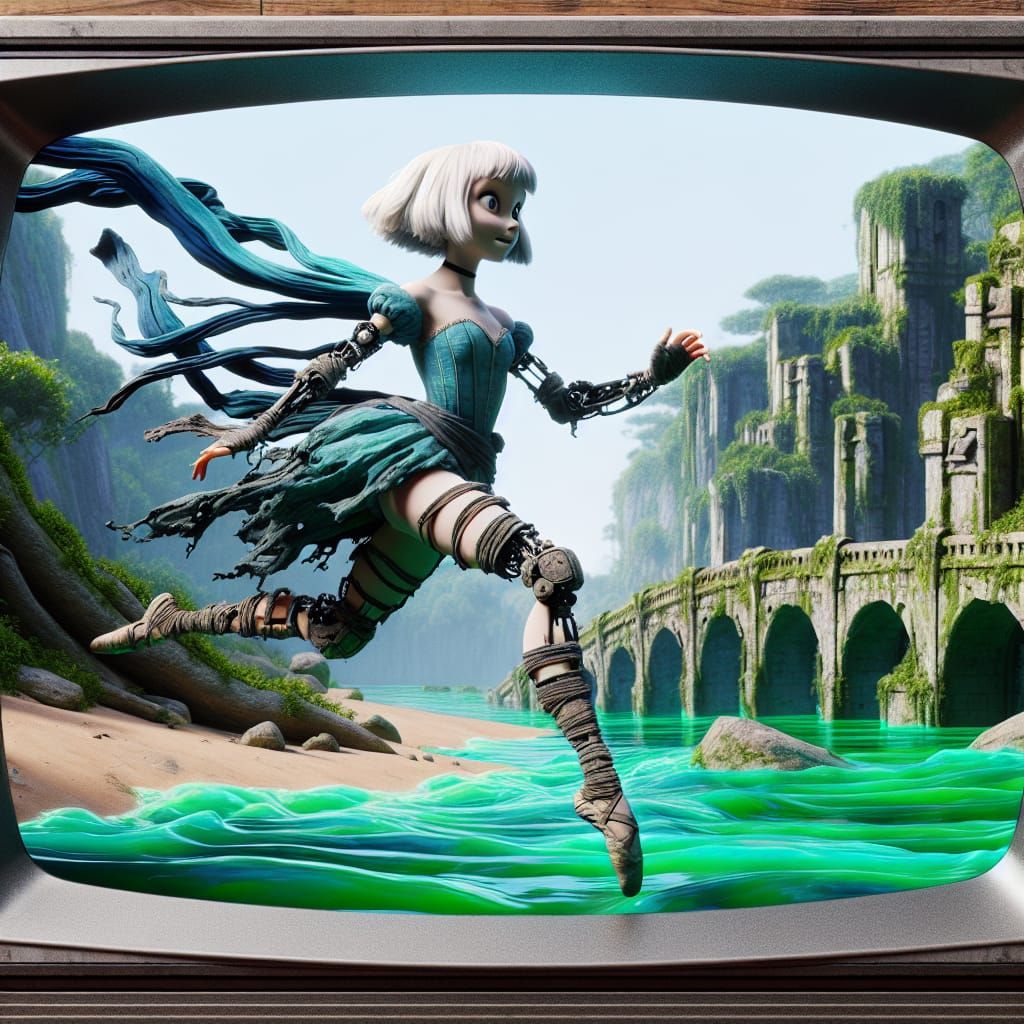 This image shows a young princess with biomechanical limbs sprinting across a dilapidated stone bridge over a river of emerald slime, surrounded by eerie jungle ruins and displayed on a vintage CRT TV screen in a retro animation style.