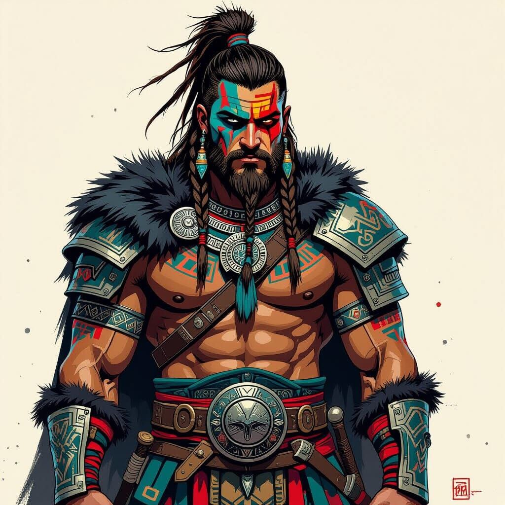 This image features a highly detailed Viking warrior wearing intricate Aztec armor and traditional tribal paint, inspired by expressive brushwork and vibrant colors.