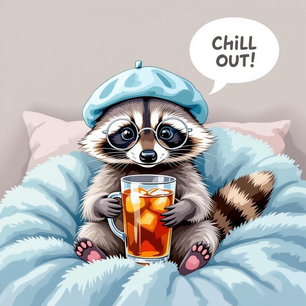 A whimsical digital watercolor of a raccoon wearing glasses and a beret, relaxing with iced tea. The artwork features soft brushstrokes and a pastel color palette.