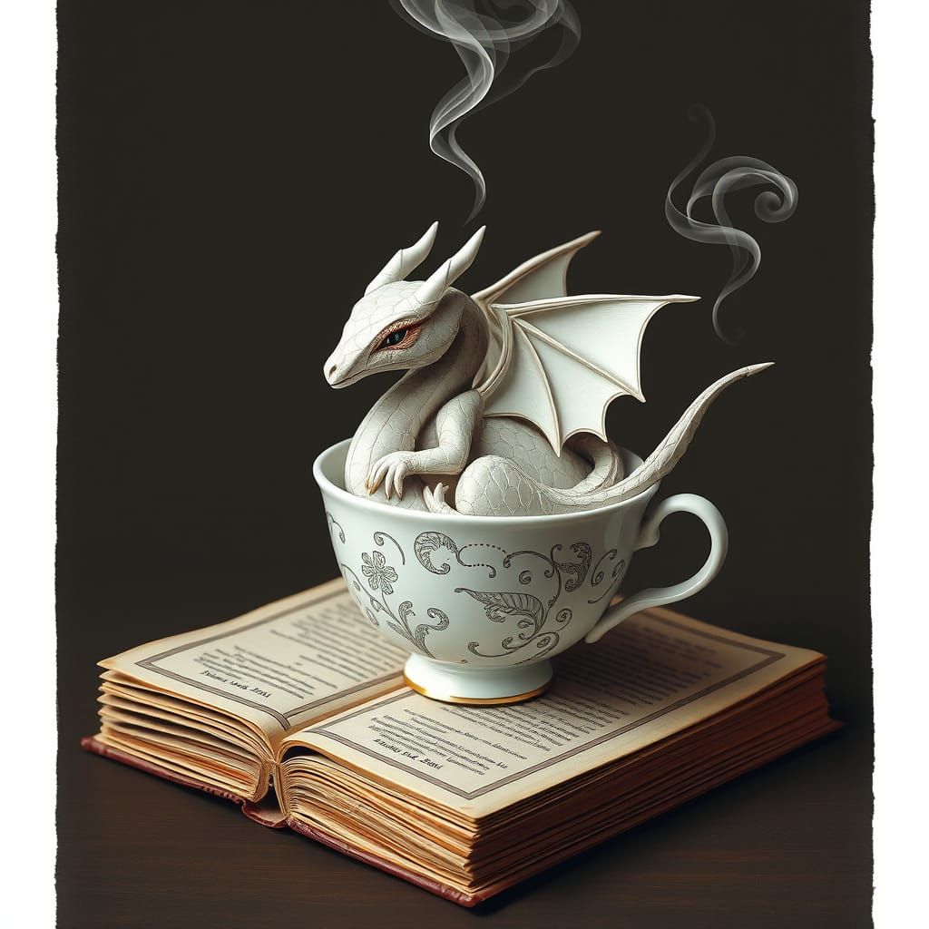 A captivating image shows a baby dragon formed from origami paper, nestled in a teacup above an old book, exhaling ink. The artwork features intricate linework in a whimsical, dreamy style.