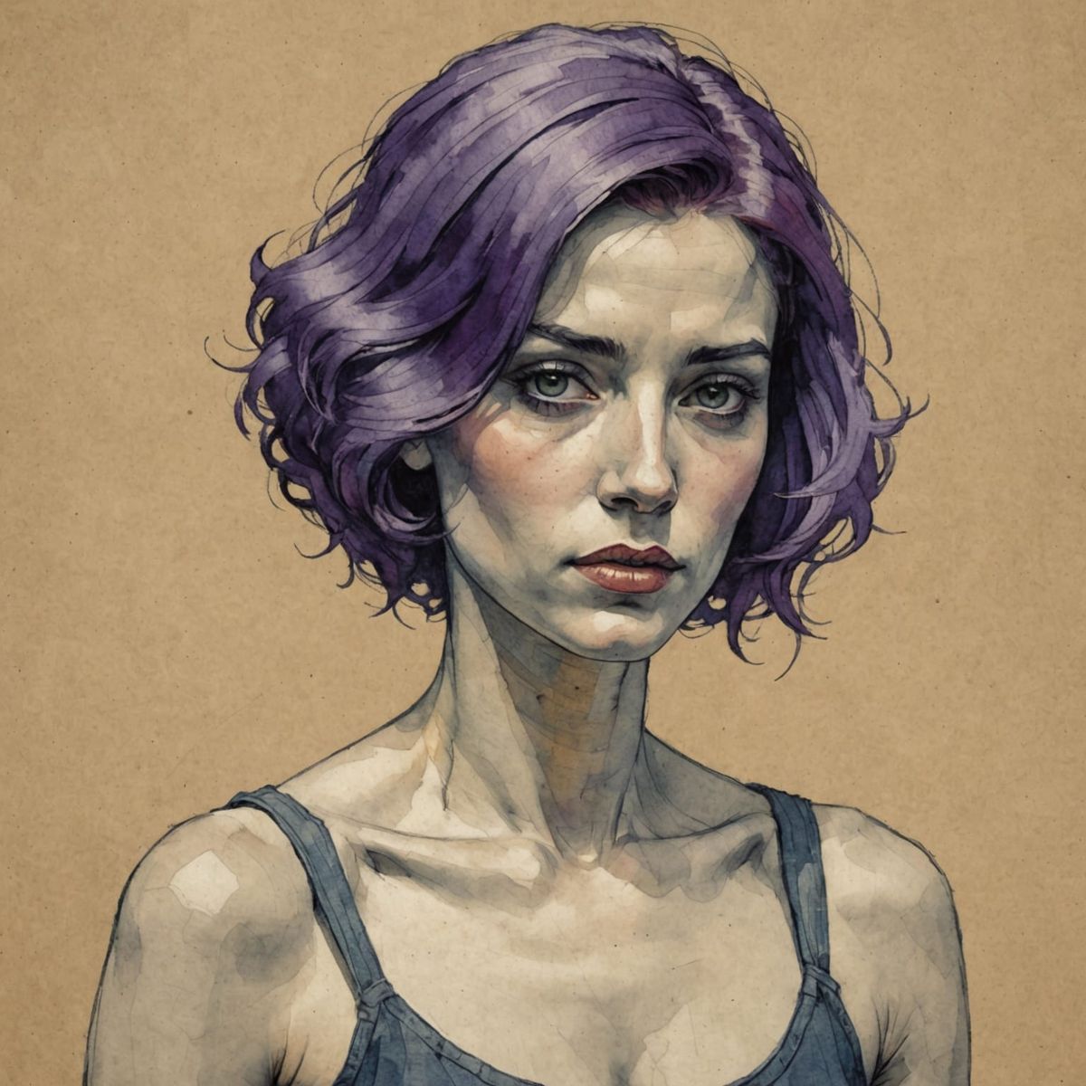 This image showcases a woman with purple hair in a striking charcoal sketch, featuring elegant lines and Art Nouveau details on old paper.