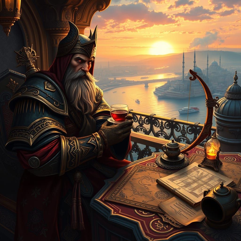 This image shows a WoW hunter in Ottoman armor with the Lich King. They are on a terrace overlooking Istanbul at sunset, drinking tea, with magical items nearby in a cinematic digital art style.