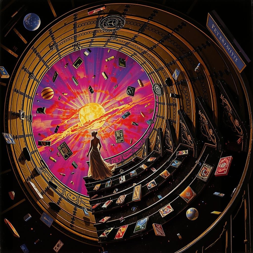 This image shows a lone woman in an Art Deco dress on a winding staircase that rises into an abstract sky. The scene is rich with detail and rendered as hyperrealistic concept art.