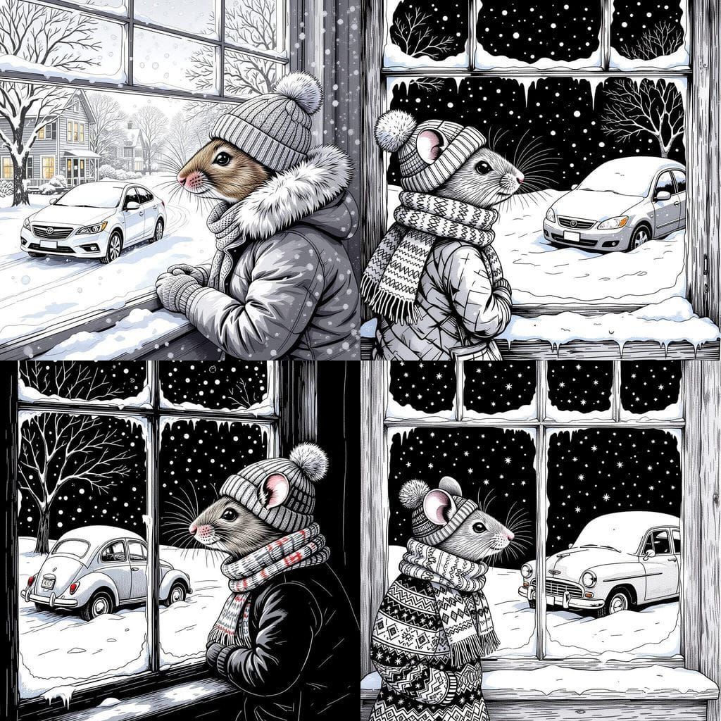 An adult coloring book style image shows a mouse staring out a window. His car is trapped in the snow outside, all rendered with thin black lines on a white background.