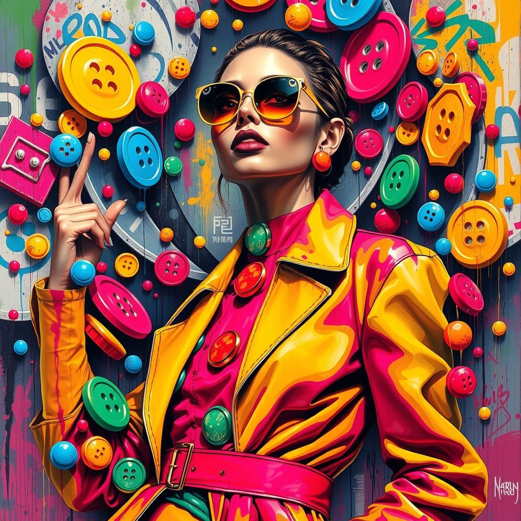 A striking picture of a fashion model in vibrant haute couture. The design features neon buttons, graffiti, and splash art in a pop art style, reminiscent of mixed media with a cyberpunk edge.