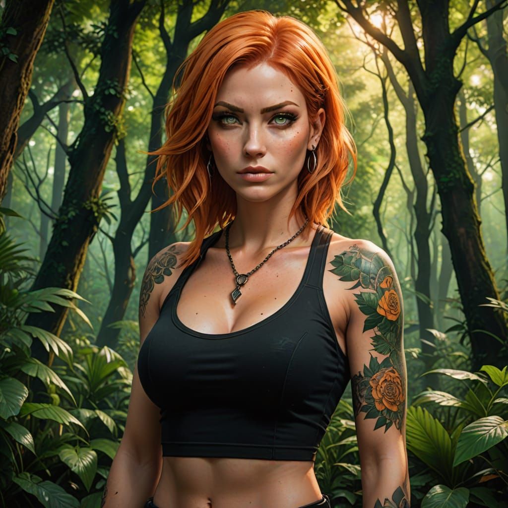 A captivating portrait of a strong woman with vibrant orange hair and intense green eyes, set against a lush forest backdrop. The digital art features dramatic lighting and anime style.