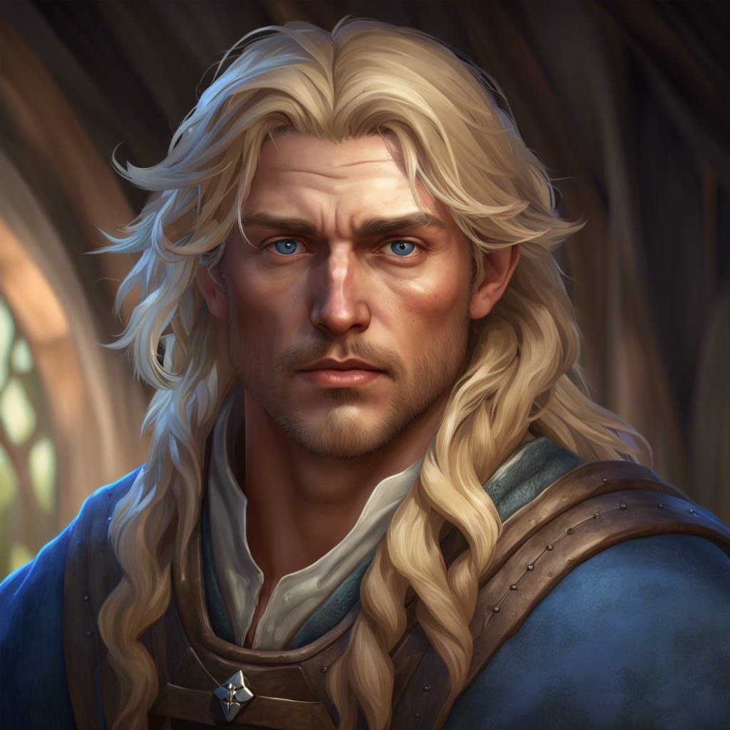 A highly detailed portrait of a blonde, blue-eyed medieval German peasant. The image employs dynamic lighting and intricate details, rendered with triadic colors in a digital art style.
