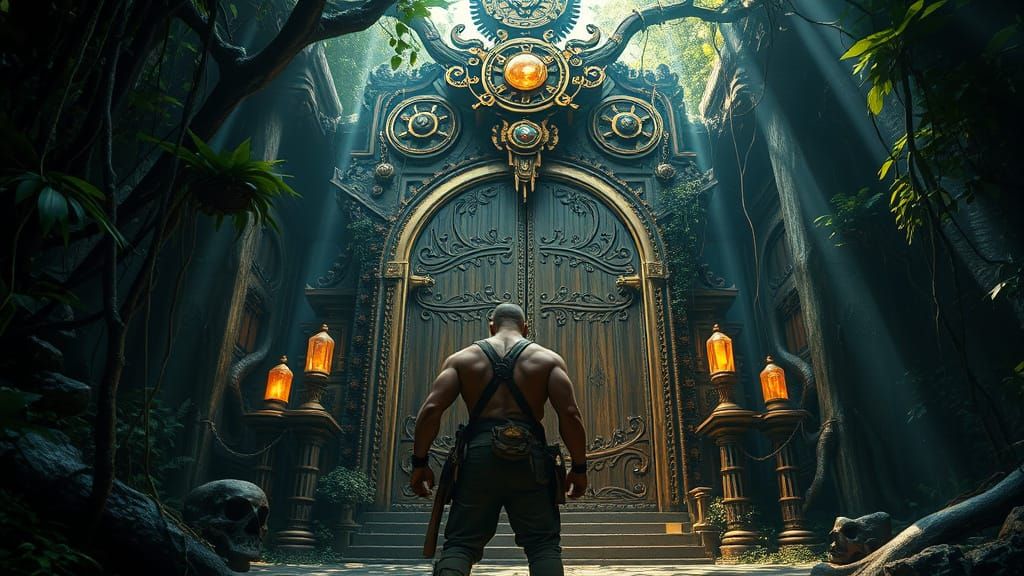 This image shows an adventurer before a steampunk gate in a jungle temple. Sunlight illuminates the scene. Vines intertwine with brass gears and crystals, in a hyperdetailed digital painting with cinematic lighting.