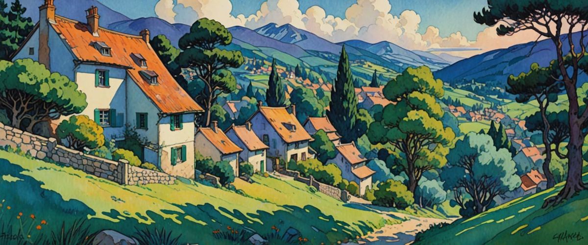 This image shows a vibrant village scene under a clear blue sky. The artwork features a watercolor and gouache style, reminiscent of Impressionist paintings with volumetric lighting.