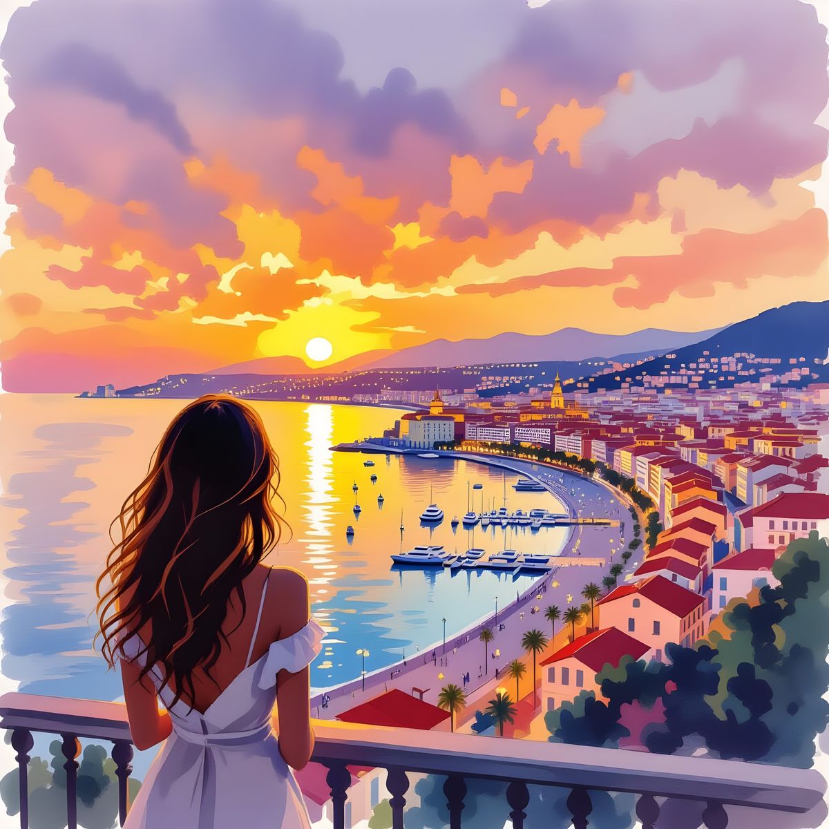 This image shows a 30-year-old woman with long, wavy brown hair looking out over the city of Nice. The scene captures a serene moment of contemplation.