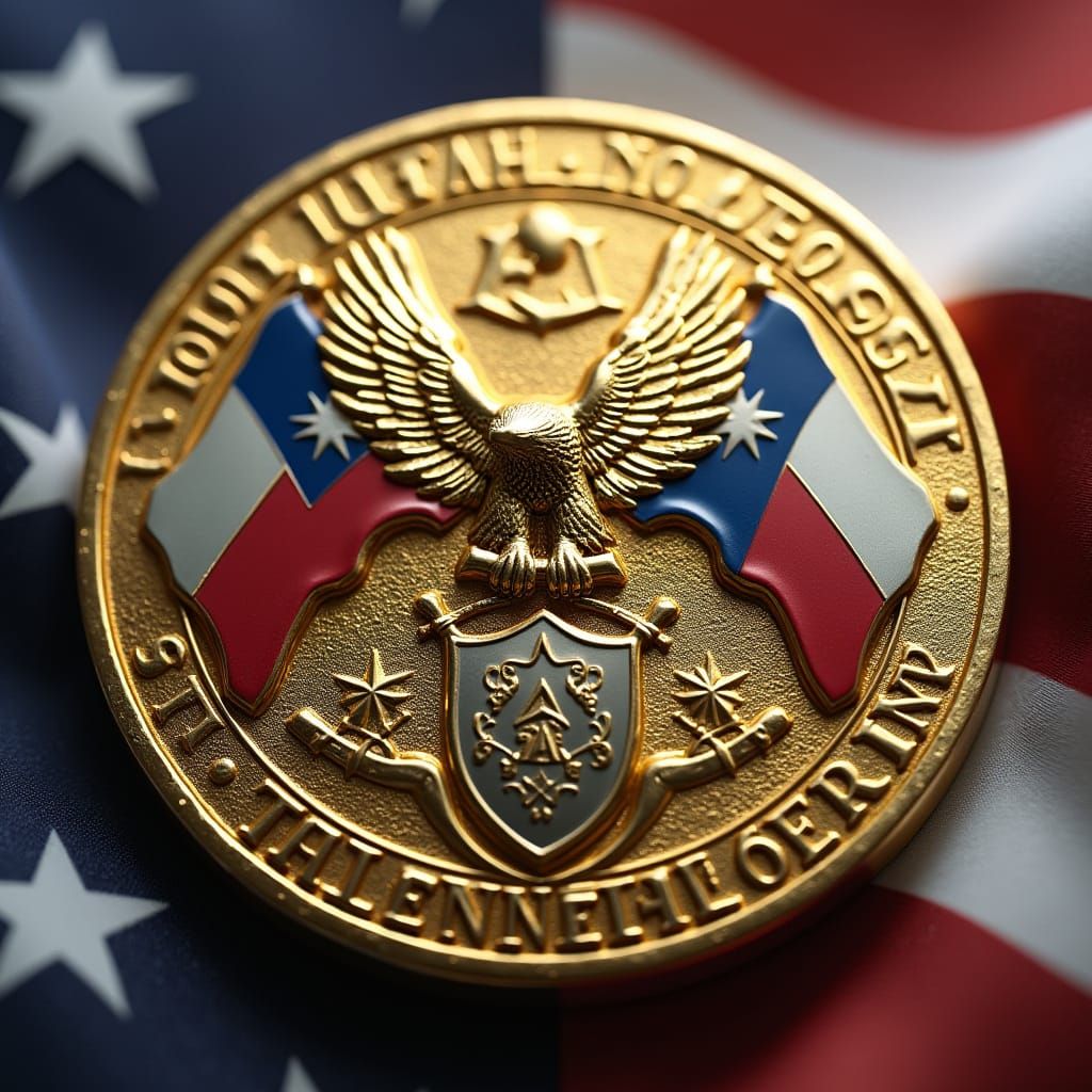 This image depicts a highly detailed shiny gold challenge coin, adorned with American and Texas flags, featuring a bald eagle in mid-flight, surrounded by a shield with the inscription 'Land, Air & Sea', symbolizing United States Nuclear Security, with intricate details and vibrant colors reminiscent of ...