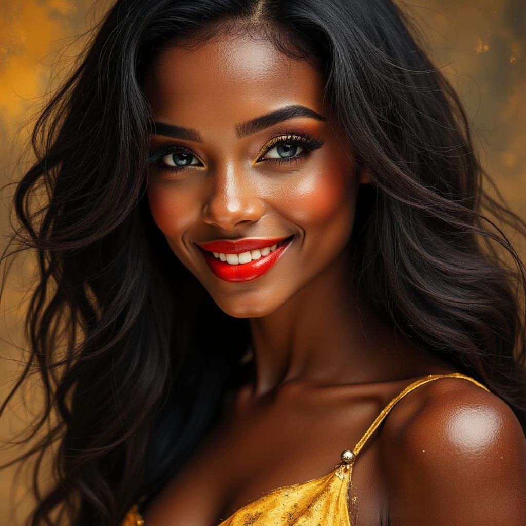 A close-up portrait of a smiling African Goddess with sun-kissed skin and mesmerizing blue eyes. Captured in a stunning studio photography style with soft lighting, reminiscent of Vogue editorials.