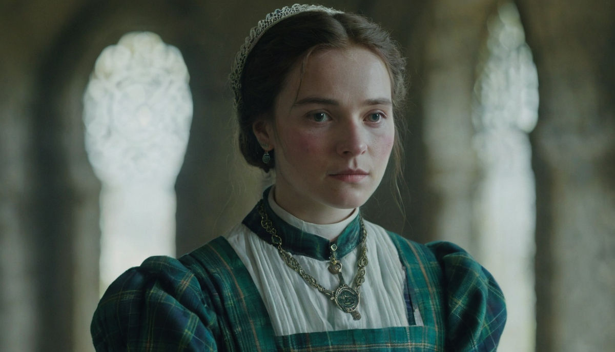 A cinematic portrait of a medieval maid in vibrant colors, wearing McAlpin clan tartan and Celtic jewelry. Soft lighting and a blurred castle interior create an atmospheric scene.
