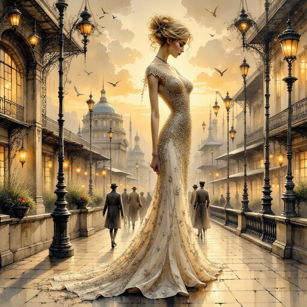 A digital painting of a platinum blonde woman in an evening gown, standing in a plaza. The image features intricate details and ornate patterns in an Art Nouveau style.