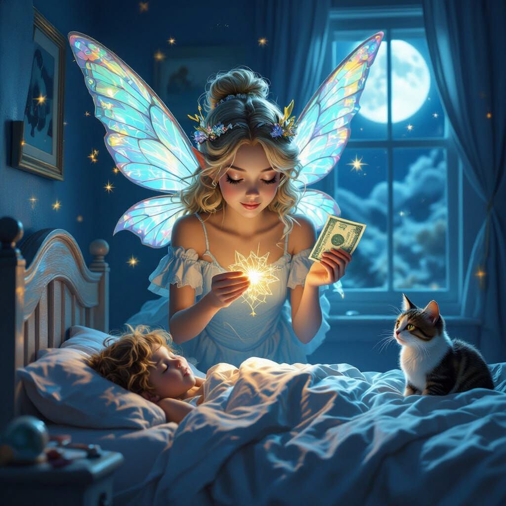 This hyperdetailed image shows the Tooth Fairy in a child's room, illuminated by volumetric moonlight and dynamic triadic colors. A cat observes the scene as the fairy hovers near a sleeping child.