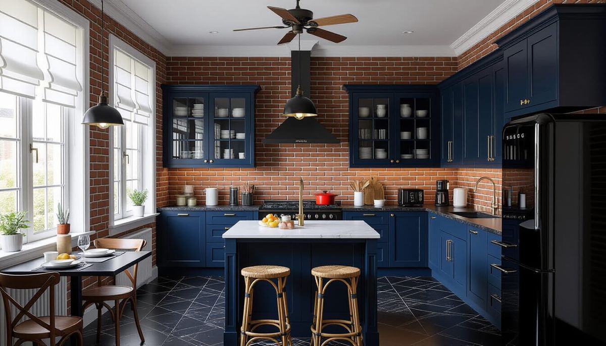 This image displays a wide-angle view of a Victorian-style kitchen featuring dark blue and brick elements, modern appliances, and a central island.